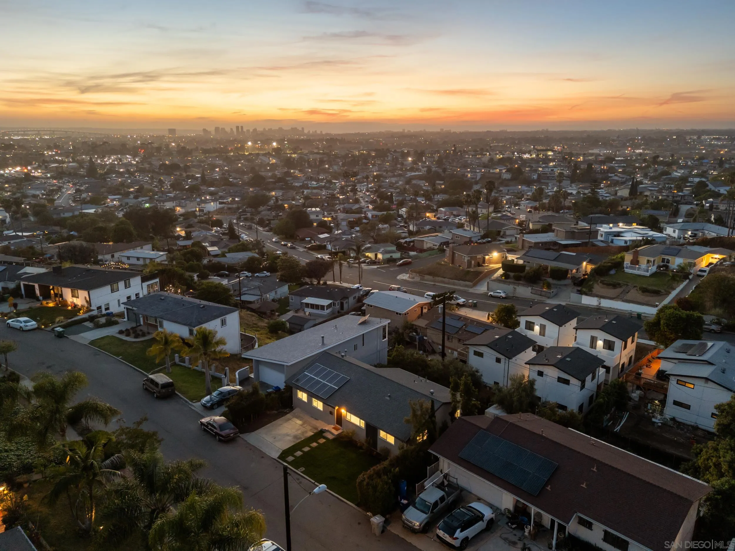 Stunning remodeled Valencia Park home with sunset views, over 1,800 sq ft, and incredible flexibility including 3 bedrooms plus up to 2 optional bedrooms. Featuring a downstairs layout ideal for multigenerational living or potential ADU conversion, plus PAID SOLAR for energy efficiency. The home offers a spacious and functional layout with a large chef’s kitchen featuring abundant cabinetry, generous counter space, and a walk-in pantry, flowing seamlessly into the main living areas. The lower level includes the primary suite with a large walk-in closet and built-in bench seating, along with two optional rooms and a separate living space—perfect for extended family, guests, or future conversion opportunities. Additional highlights include dual pane windows, central HVAC for year-round comfort, and a walk-in basement providing valuable extra storage. A rare opportunity to own a move-in ready home with space, versatility, and beautiful views in San Diego.