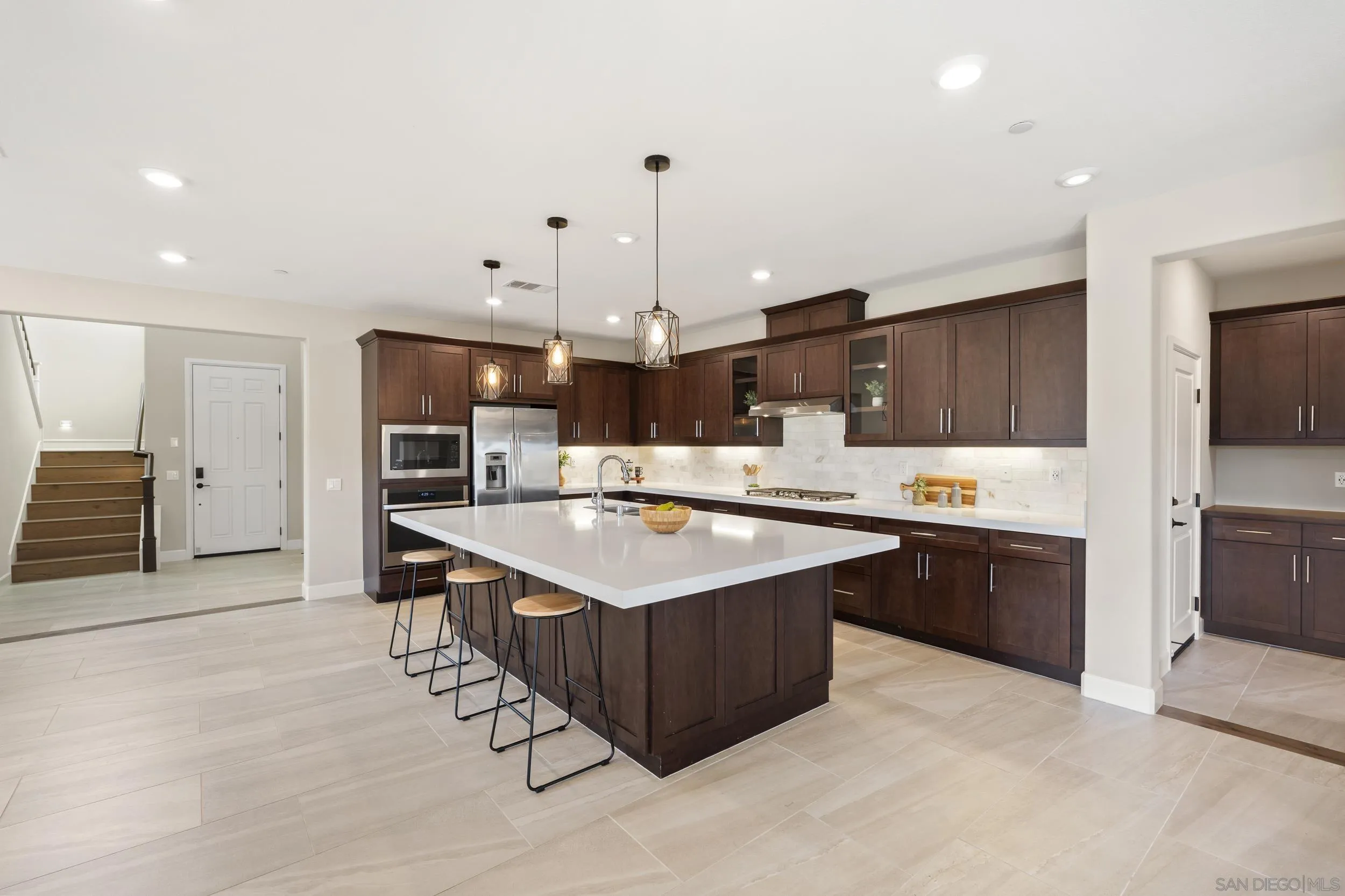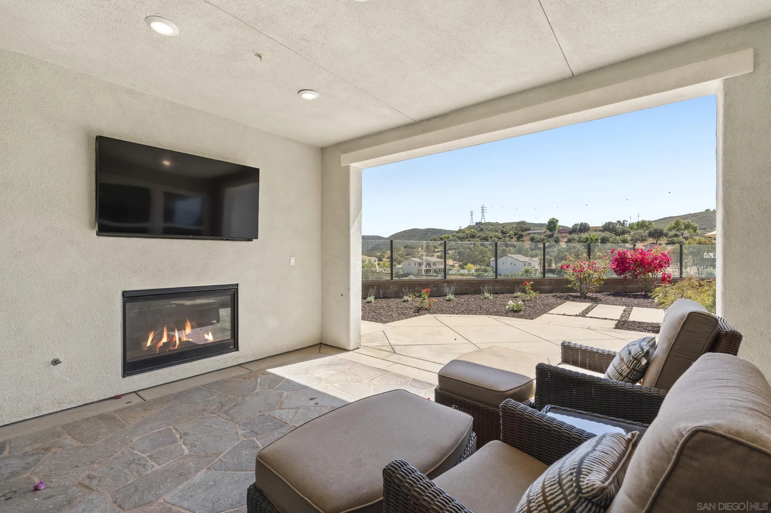 Welcome to refined Southern California living in Harmony Grove Village, where this exceptional residence features OWNED solar, sweeping 180° panoramic mountain views, and true indoor-outdoor resort-style living. Situated on a 0.18-acre lot, this beautifully upgraded home offers 4 bedrooms, 3.5 bathrooms, a dedicated office, and an upstairs loft with a private view balcony. The main-level primary suite is a private retreat with a spa-inspired bath and dual walk-in closets, complemented by a first-floor guest bedroom with full bath—ideal for multigenerational living or guests. The open-concept great room flows into a chef’s kitchen with a large center island, quartz countertops, stainless steel appliances, walk-in pantry, soft-close cabinetry, and designer lighting. Upstairs, secondary bedrooms surround a versatile loft opening to sweeping mountain views. Designed for California living, the wraparound California Room includes a built-in gas fireplace, recessed lighting, and TV wiring for year-round entertaining. The landscaped backyard features low-maintenance paver hardscaping and mature fruit trees. Additional highlights include pre-wired smart home technology throughout, three smart thermostats/HVAC zones, first-floor laundry with utility sink and cabinetry, epoxy-finished 3-car tandem garage, and extended driveway parking. Community amenities include resort-style pool, scenic trails, and playgrounds in a premier master-planned setting