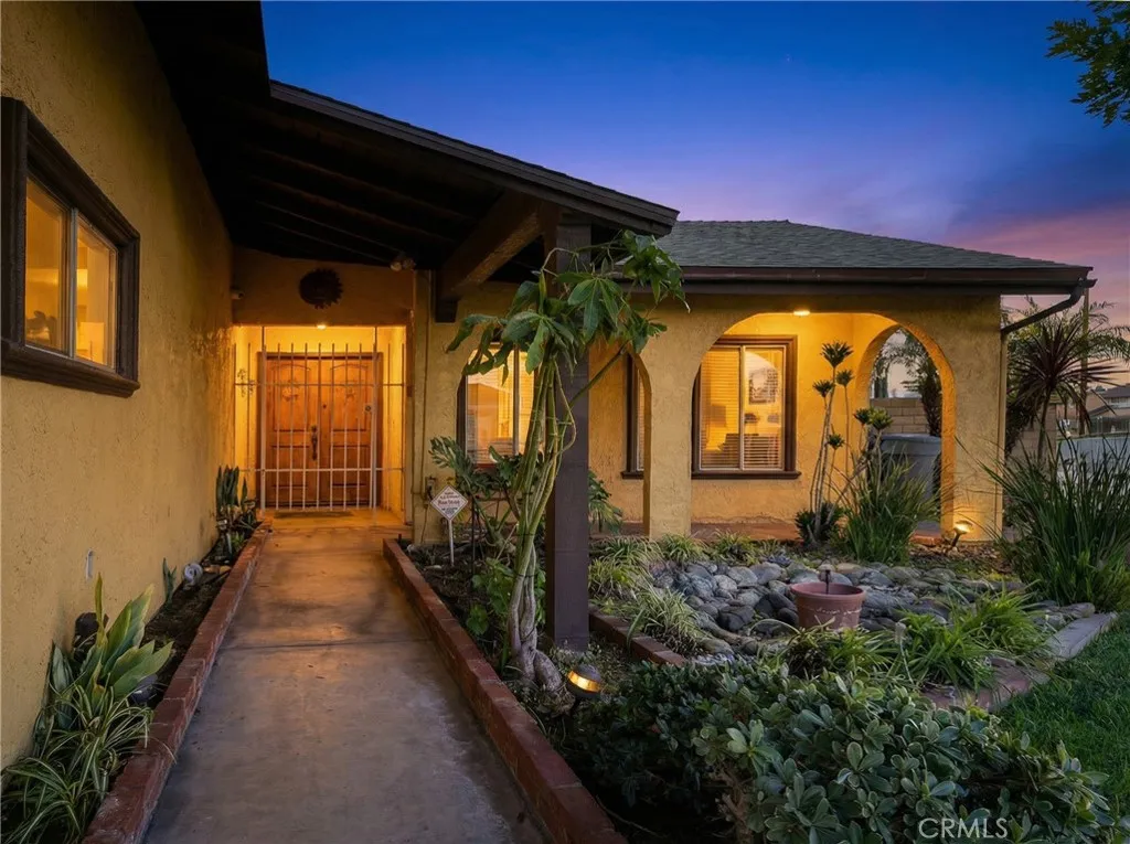 Welcome to this charming single-story Spanish Ranch-style home situated on a desirable corner lot, offering four bedrooms, two baths, classic curb appeal, and a welcoming arched entry framed by a fully landscaped yard, concrete pathway, covered front porch, and tranquil koi pond feature. Inside, enjoy tile flooring throughout, a spacious family room ideal for gatherings, and ceiling fans in all bedrooms and living areas. The upgraded main kitchen features granite countertops and cabinetry and includes the refrigerator, washer, and dryer for move-in convenience. A separate built-in mini kitchenette/flex prep zone with upper and lower cabinetry, countertop space, and sink adds versatilityideal for entertaining, beverage service, extended family use, or a coffee and prep station. The dining area opens to a patio through sliding glass doors, perfect for outdoor dining or relaxing in the yard. Both bathrooms are fully tiled, including the primary shower, offering a clean and timeless look. The backyard is designed for both entertaining and relaxation, featuring a covered outdoor BBQ alcove with custom brick surround, suitable for a permanent or portable grill, along with a secluded above-ground spa positioned beneath a covered gazebo for year-round enjoyment. Additional features include four storage units, a hard-wired security camera system (monthly subscription required), and fresh interior paint throughout, including ceilings. The oversized garage includes an upgraded workshop floor and enclosed overhead storage with pull-down ladder access, all recently painted. This home of