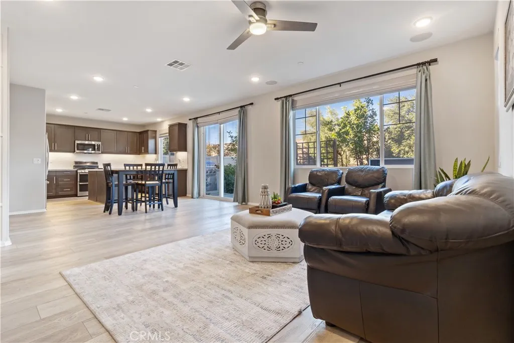 Set within the Atwell Community, this well-appointed corner lot home blends modern design with everyday functionality. Originally designed as a model, the residence showcases curated finishes and a layout suited for both entertaining and comfortable living. The exterior offers a polished presentation with fully landscaped and irrigated grounds, while the backyard provides a private retreat featuring a built-in BBQ, and open sky views toward the surrounding foothills. Indoor and outdoor spaces connect easily, creating a relaxed flow ideal for gatherings or quiet evenings at home. Inside, the main level delivers an open living environment accented by custom design elements and durable flooring. A downstairs bedroom and full bathroom add versatility for guests or remote work. The kitchen anchors the space with contemporary finishes, generous storage, and a large island designed for daily use and casual dining. The upper level opens to a flexible loft area, along with additional bedrooms and a private primary suite. The primary retreat offers two (2) separate ample walk-in closets and a well-designed bathroom with dual sinks, a soaking tub, and a separate shower. Practical features such as an upstairs laundry room and added storage enhance everyday convenience. Additional highlights include window treatments throughout, integrated security cameras, direct access to the attached two-car garage, and fully paid solar, delivering long-term energy efficiency. Community amenities include walking trails, recreational spaces, a pool, and a playground. All with nearby freeway access to