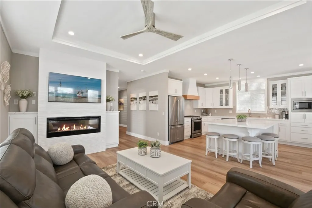 Welcome to this stunning year 2024 manufactured home offering modern coastal living just minutes from the Ocean. Located within the desirable 55+ Senior Living Community of Rancho Del Rey Estates, this guard-gated park provides both comfort and peace of mind. Humboldt Public Beach in Huntington Harbour is within walking distance across the street, a great place to relax, bring your kayak or enjoy paddleboarding. This home is Gorgeous and Elegant! * Central Air-Conditioning * Fireplace * Spacious Kitchen for Entertaining * Large Oversized Quartz Kitchen Island and Countertops * Custom Tile Backsplash in Kitchen * Custom Built Hood * Stainless Steel Appliances * Tray Ceiling * 9' Ceilings * Beautiful Wood Laminate Flooring Throughout * All Baths have Quartz Countertops * Large Primary Bedroom with Walk-In Closet (easily fits a King size bed) * Large Primary Bathroom with Dual Sinks and Beautiful Bathtub * Led Lighted Mirrors in primary bath * Front Landscape has Automatic Sprinklers & Lighting * Side Parking for a possible Golf Cart. This community has two clubhouses that offer year round heated pools, jetted spas, saunas and a security guard entrance. Convenient Location, within close proximity to Ocean, Wetland hiking trails, Freeway, Restaurants and Shopping. * Park Approval is required upon purchasing. The monthly space rent at this park is at $2350 per month.