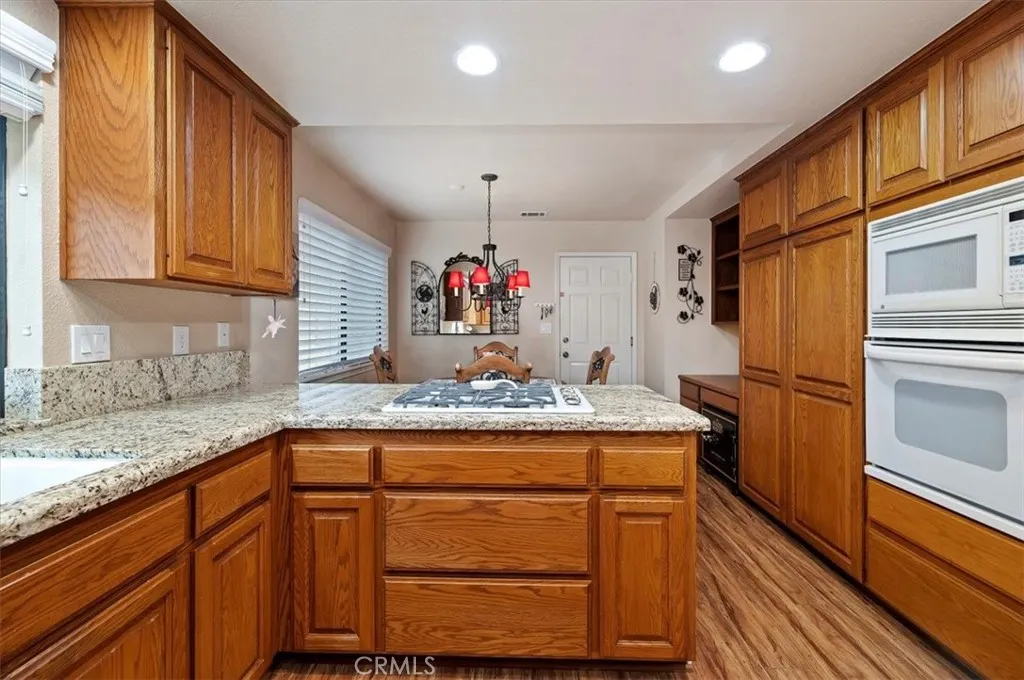 NEW PRICE! Discover the comfort and convenience of 55+ living in this beautiful gated community. This well-situated home offers picturesque views and a peaceful backyard with no rear neighbors. Featuring 3 oversized bedrooms and 2.5 bathrooms, the home includes a cozy family room with a fireplace, a formal dining room, and an elegant kitchen with granite countertops, oak cabinetry, and an additional dining area. The spacious primary suite boasts a walk-in closet and an en-suite bathroom with dual sinks, a tile vanity, and a walk-in shower. A convenient powder room is located just down the hall for guests, while the secondary bathroom features a tub and tile vanity. Laminate flooring flows throughout the home, with tile in the bathrooms. Additional highlights include direct garage access, laundry located in the garage, and guest parking conveniently located directly across from the home. Enjoy the lushly landscaped front and backyard, complete with fruit trees, fenced yard for privacy and pet safety, and walkways throughout the outdoor space. The community offers an impressive array of amenities, including a swimming pool, hiking trails, tennis courts, pickleball, clubhouse, and RV storage. Come experience this amazing community for yourselfyoull quickly see why this is the perfect place to call home.