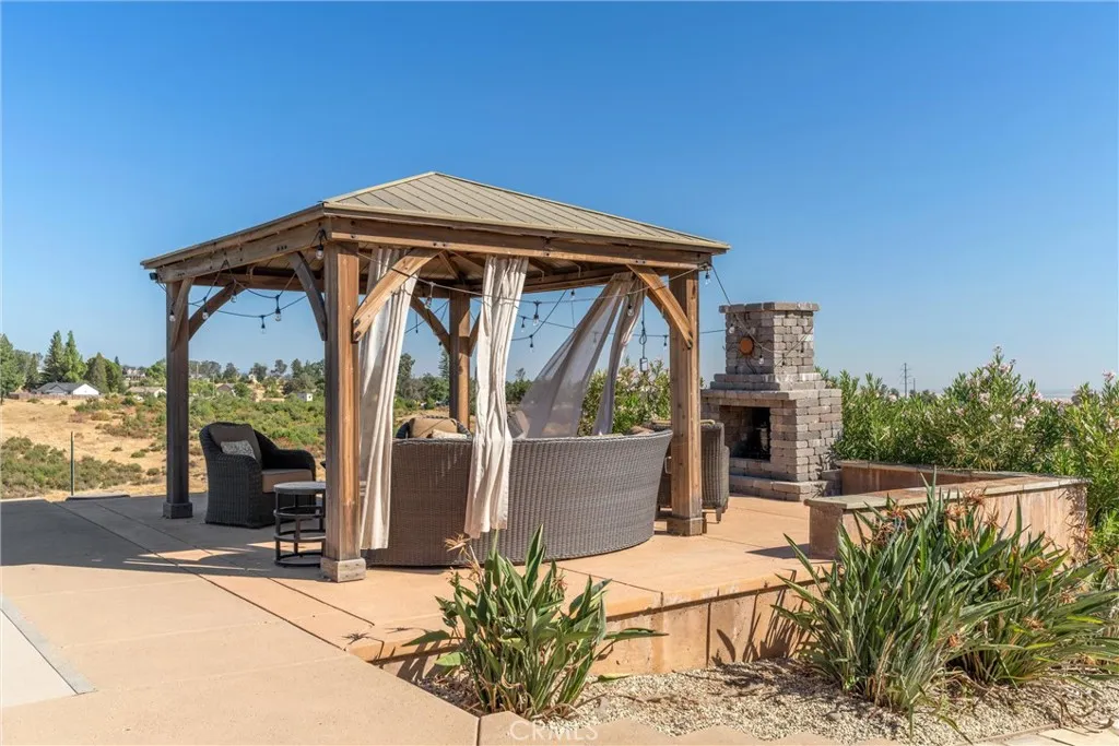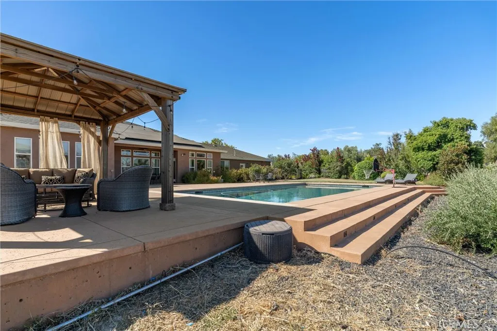 Elegant Gated Estate with Sweeping Views, Saltwater Pool Minutes from Chico Tucked at the end of a quiet cul-de-sac within the sought-after gated community of Blue Oak Terrace, this estate offers a rare combination of luxury, privacy, and everyday functionality. Set on over two beautifully landscaped acres, the property captures valley and mountain views in a serene setting. The interior is thoughtfully designed and filled with natural light, featuring travertine and wood flooring throughout the main living areas, graceful arched doorways, soaring ceilings, and floor-to-ceiling windows that frame the scenery beyond. The spacious living room showcases a striking fireplace and custom tray ceilings and flows seamlessly into the well-appointed kitchen, complete with granite countertops, bar-top seating, newer appliances, and rich knotty alder cabinetry. Adjacent dining space overlooks the pool, creating an ideal backdrop for gatherings and entertaining. A split floorplan enhances privacy and versatility. One wing of the home includes an office, two guest bedrooms, and a full bathroom with direct pool access, while the opposite side offers an additional guest bedroom, full bathroom, and the private primary suite. The primary retreat is generous in size and features its own patio and spa access, dual walk-in closets, and an elegant en-suite bath with soaking tub, large walk-in shower, and dual vanities. Outside, the grounds feature a beautiful saltwater pool, lush front and rear lawns, an outdoor fireplace, a basketball court, and an additional driveway providing abundant parkin