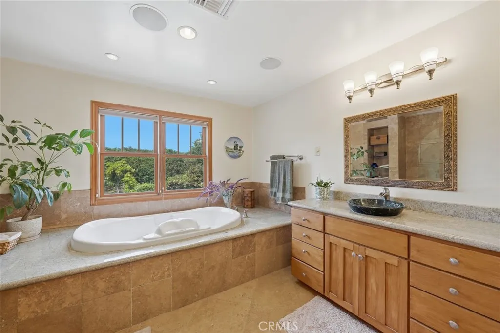 Welcome to this beautifully designed home in the highly sought-after La Costa area of Carlsbad, where comfort, functionality, and charm come together in a truly inviting setting. Ideally located on a quiet cul-de-sac, 5 miles from the beach and surrounded by scenic hiking trails, this home offers the perfect balance of outdoor lifestyle and everyday convenience. Backing directly to La Costa Heights Elementary, the location provides both privacy and a strong sense of community. Step inside to find a warm and thoughtfully crafted interior, featuring solid wood doors and double-hung wood windows throughout that fill the home with natural light while adding timeless character. A whole-house, two-stage water filtration system enhances everyday living. The custom floor plan offers both versatility and space, with three generously sized bedrooms upstairs and an additional bedroom downstairsideal for guests or multigenerational living. A standout feature is the expansive office, complete with its own private entrance through a custom Dutch door and accented by a beautiful stained glass side window, making it perfect for a home-based business, creative studio, or quiet retreat. Custom hardwood maple cabinetry is carried throughout the home, blending style with function. The kitchen is designed for both daily living and entertaining, featuring travertine flooring and a premium Dacor double convection oven and 36" cooktop. The spacious game room provides a perfect place to gather, complete with a wet bar and under-counter refrigerator for easy hosting. Step outside through the 9-foot