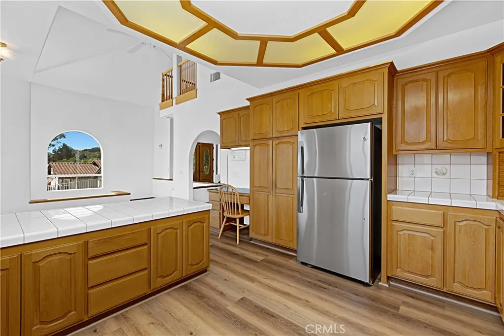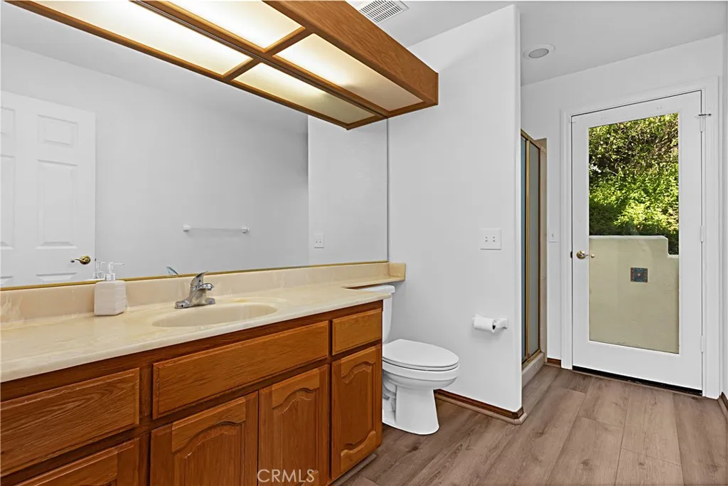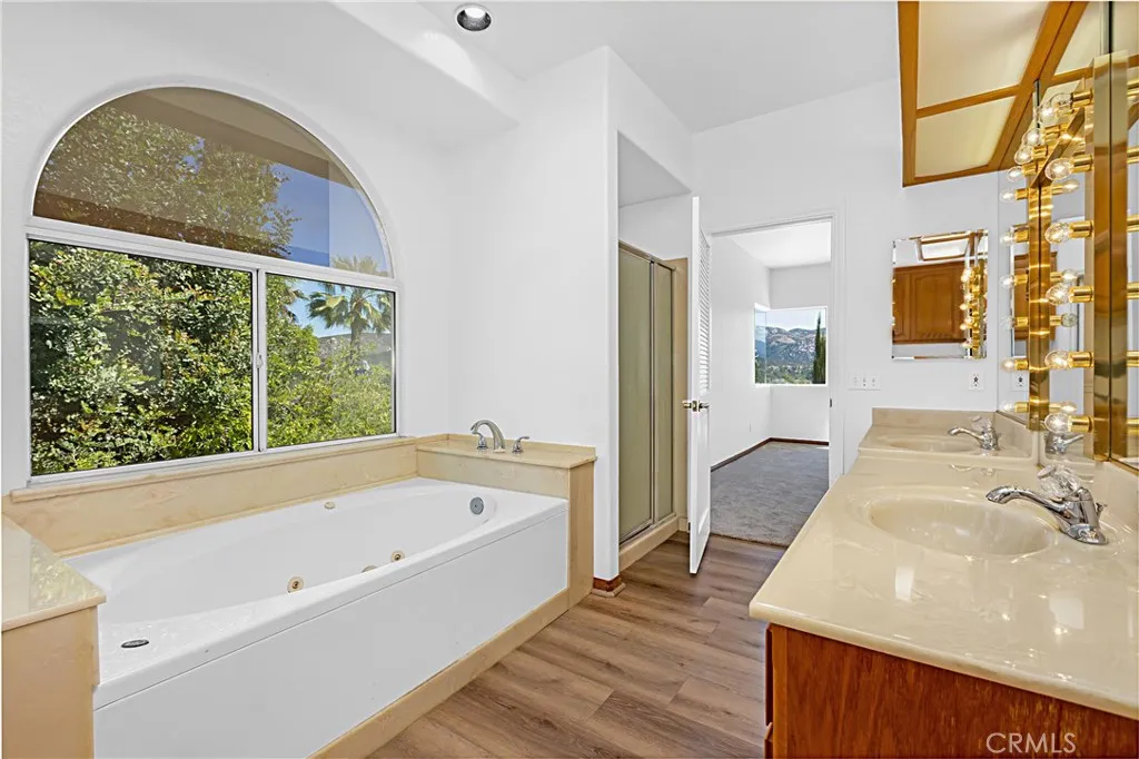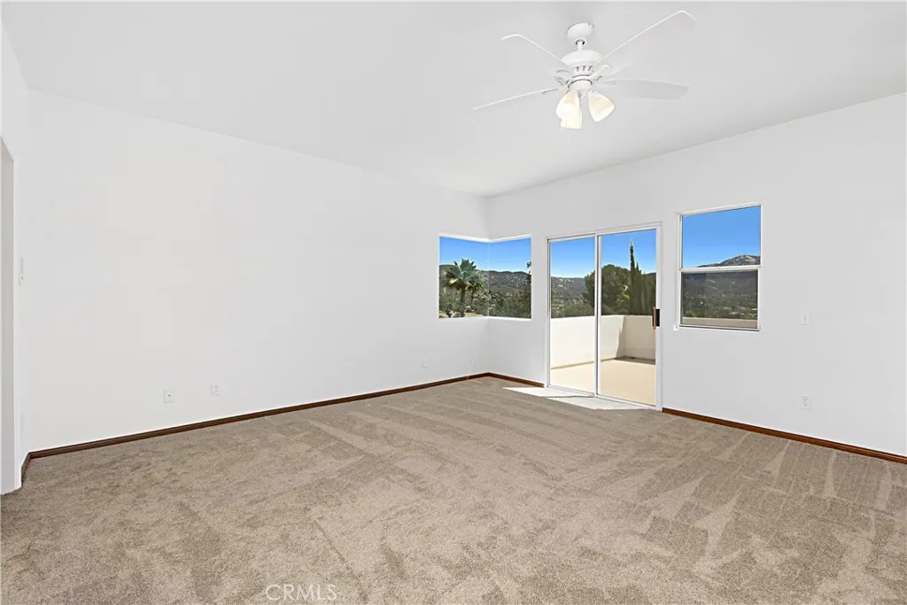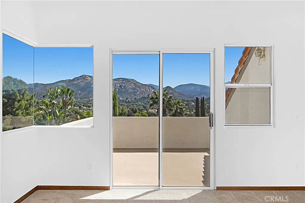 Stunning residence showcasing panoramic mountain and valley views, ideally situated within the highly sought-after San Diego Country Estates. Perched on an elevated gated lot, this light-filled home features expansive windows and an open-concept floor plan designed to capture breathtaking scenery from nearly every room. The home was recently painted inside and outside. Brand new flooring was chosen that includes Paradigm luxury vinyl waterproof plank flooring downstairs, and new Shaw plush carpeting upstairs. The spacious living room boasts dramatic ceilings, abundant natural light, and oversized windows that beautifully frame the surrounding landscape. The adjacent dining area flows seamlessly into the kitchen and the outdoor patio for indoor-outdoor living and entertaining. The kitchen is equipped with brand-new GE Profile appliances; including a refrigerator, convection range, oven, microwave, dishwasher, and trash compactor. Ample cabinetry and generous counter space provide both functionality and style. Just off the kitchen, a cozy family room with a stone-accented fireplace offers a warm and inviting atmosphere. The formal dining room with a wet bar, is perfect for hosting gatherings. Downstairs there is a room that can be used as a bedroom or a home office. Upstairs, there are 3-bedrooms and 3-bathrooms which include an oversized Master suite featuring vaulted ceilings, private outdoor access to a balcony, and an en-suite bathroom with dual vanities, a bathtub, and a separate shower. The 2 additional upstairs bedrooms are generously sized and offer flexible use for f